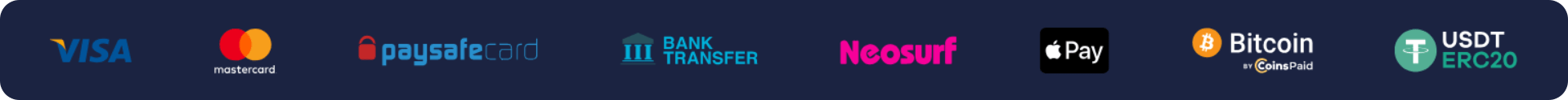 Visa, Mastercard, Maestro, Neosurf, MiFinity, Bitcoin, Ethereum, Litecoin, Bitcoin Cash, Dogecoin, USDT.